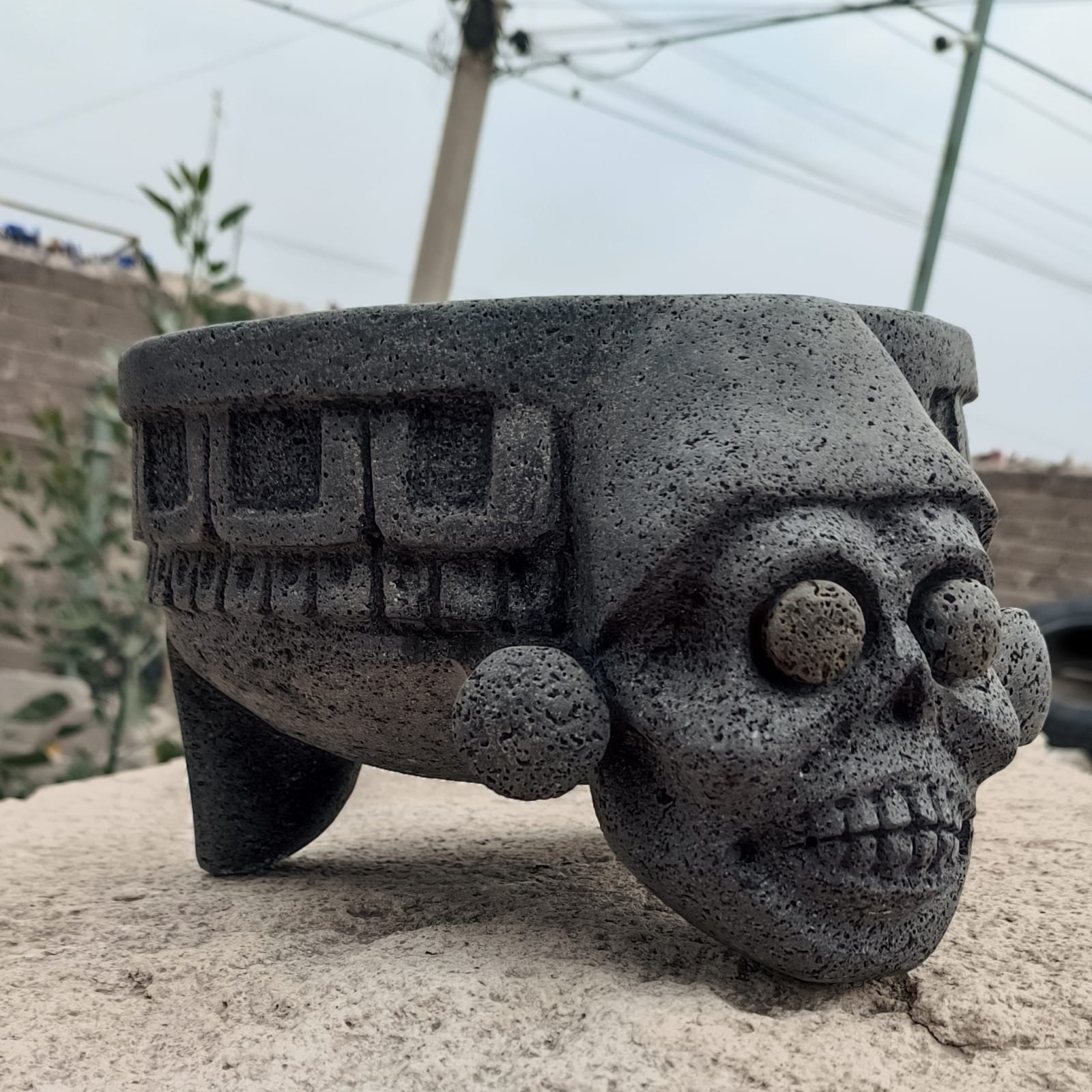 Diseño exclusivo de molcajete en piedra volcánica, adornado con talla directa de faldellín prehispánico y rostro de Mictlantecuhtli, que a pesar de ser el dios de la muerte, también está asociado con la vida y la creación. El toque de distinción en tu arsenal de cocina.