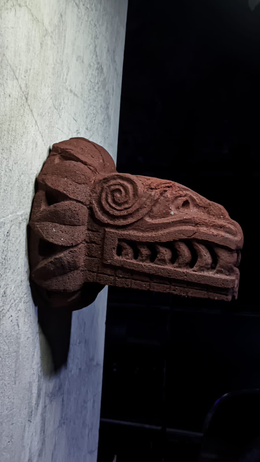 Escultura en forma de cabeza de Quetzalcóatl, hecho en cantera, con medidas de 25cm x 27cm aprox. Para colgar y adornar.